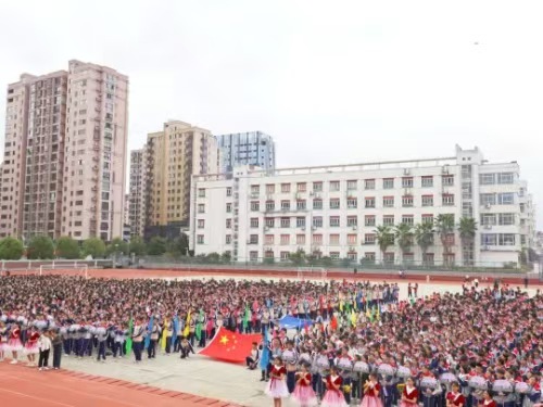 国旗队、校旗队与彩旗队率先步入运动场,步伐铿锵,旗帜猎猎。紧随其后的鲜花队手持绚丽花束,以灿烂的笑容为赛场注入勃勃生机,为开幕式绘就一幅活力与色彩交织的动人画卷。各年级运动员代表以方阵形式入场。他们眼神坚定,步伐整齐,彰显出必胜的信念与青春的锋芒。随后,该校田径队运动员手持国旗奔跑入场,五星红旗迎风招展,瞬间点燃全场爱国热情,自豪感油然而生。裁判员队伍紧随其后,他们将以公正严谨的态度,为赛事保驾护航。