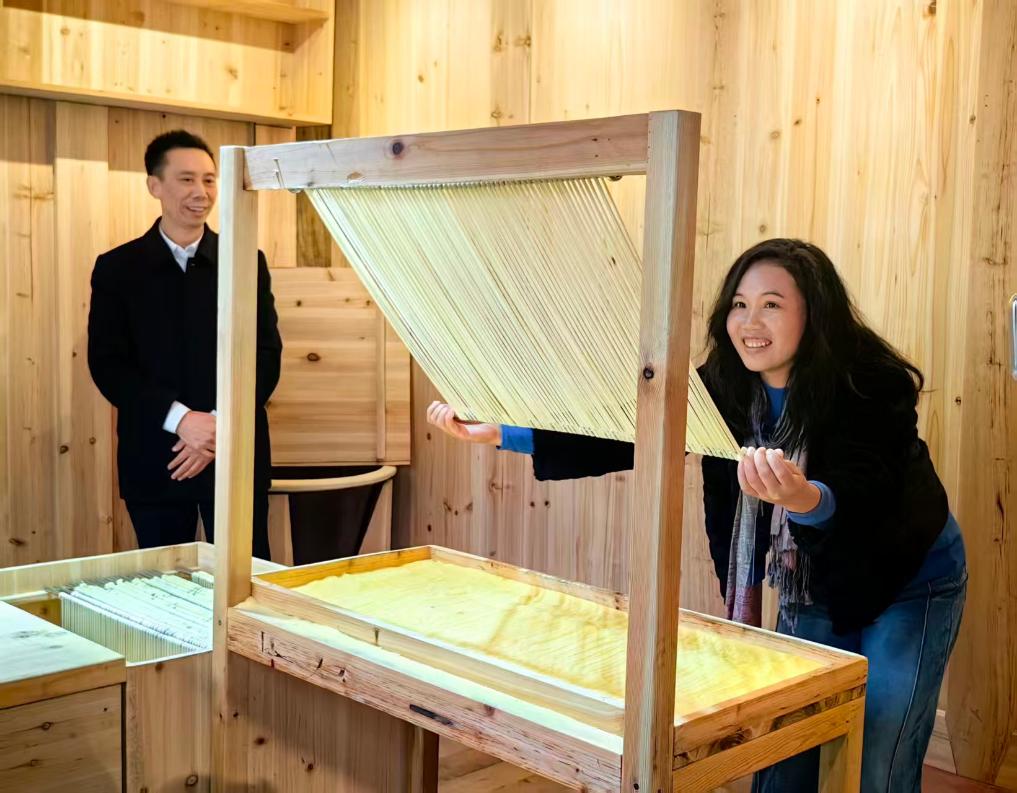 11月24日,海外华文媒体代表在云阳县巴阳杠子面生产工厂体验制作巴阳杠子面。新华社记者 吴梦桐 摄