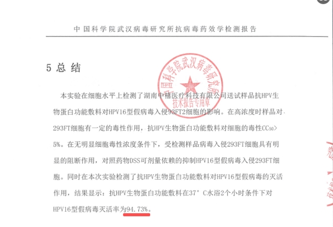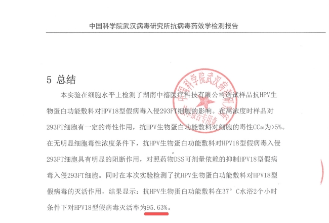 通过查询相关网站资料,发现卫茵清品牌的热销产品卫茵清抗HPV生物蛋白敷料在《中国科学院武汉病毒研究所抗病毒药效学检测报告》中显示,对HPV16型病毒灭活率94.73%,HPV18型病毒灭活率95.63%。