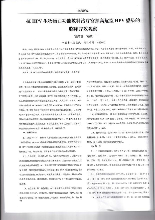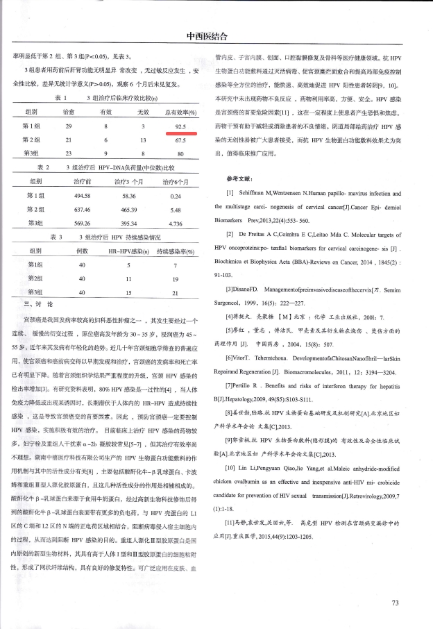 在十堰市人民医院的临床研究《抗HPV生物蛋白功能敷料治疗宫颈高危型HPV感染的临床疗效观察》中数据显示,该产品的抗HPV病毒总有效率92.5%。