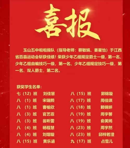 在刚刚落幕的“奔跑吧·赣鄱少年”“中国体育彩票杯”江西省第二届“龙南·围屋之都”杯百县青少年啦啦操运动会上,江西省上饶市玉山县第五中学啦啦操梦之队凭借精湛技艺与默契配合,斩获少年乙组三冠一亚的辉煌战绩,生动诠释了玉山五中“敦学砺品,身心两健”的育人理念,尽显五中学子的昂扬朝气与青春风采!