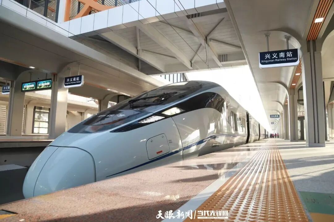 停靠在兴义南站等待出发的盘兴高铁首发列车(郑尉摄)