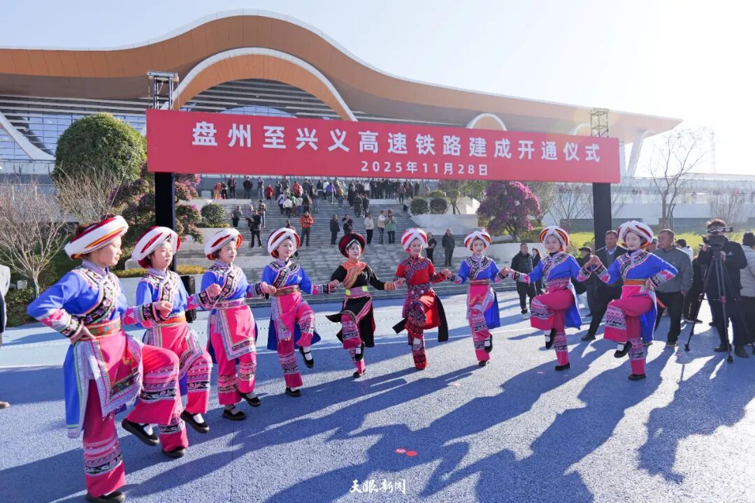11月28日,盘州至兴义高速铁路(盘兴高铁)开通仪式在兴义南站站前广场举行,群众在广场上跳起踢踏舞庆祝。贵州日报天眼新闻记者黄飛鸿摄